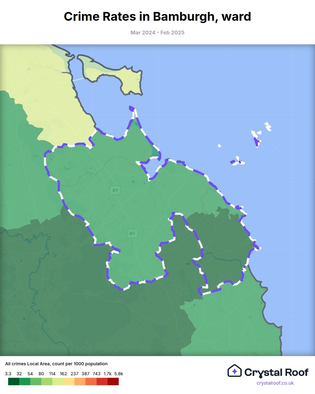 Bamburgh, (ward) includes areas with the following crime ratings (see map):