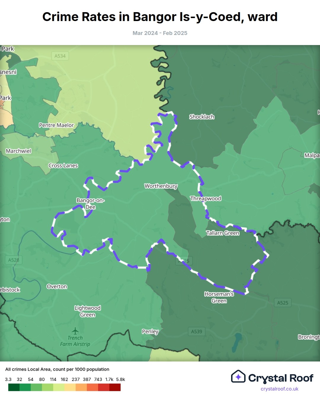 Bangor Is-y-Coed, (ward) includes areas with the following crime ratings (see map):
