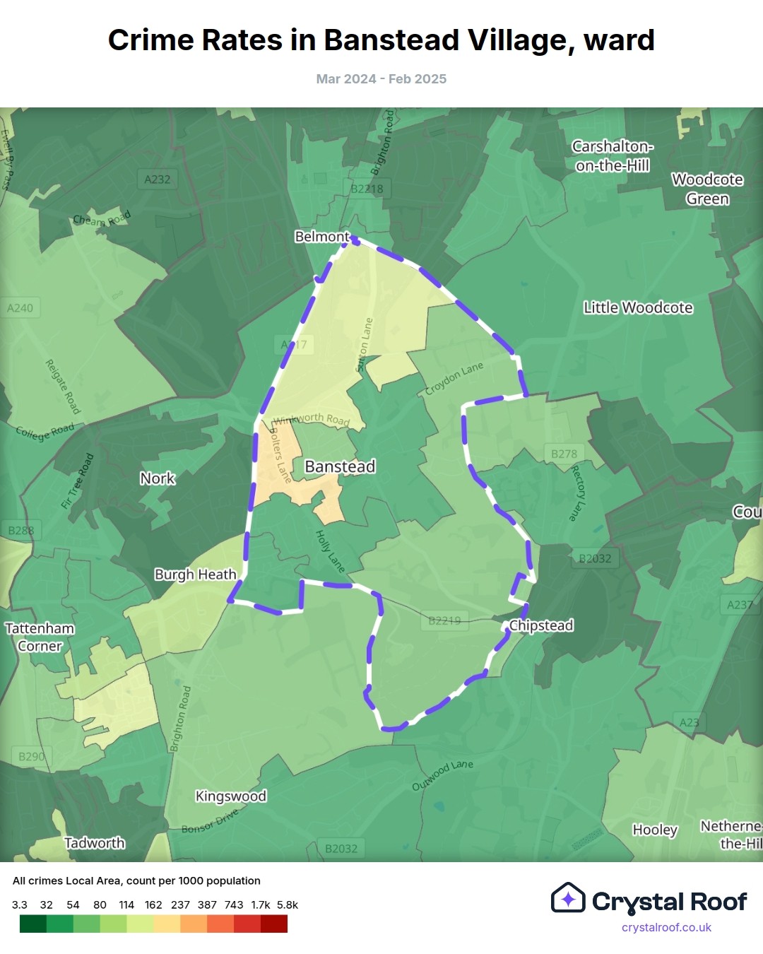 Banstead Village, (ward) includes areas with the following crime ratings (see map):