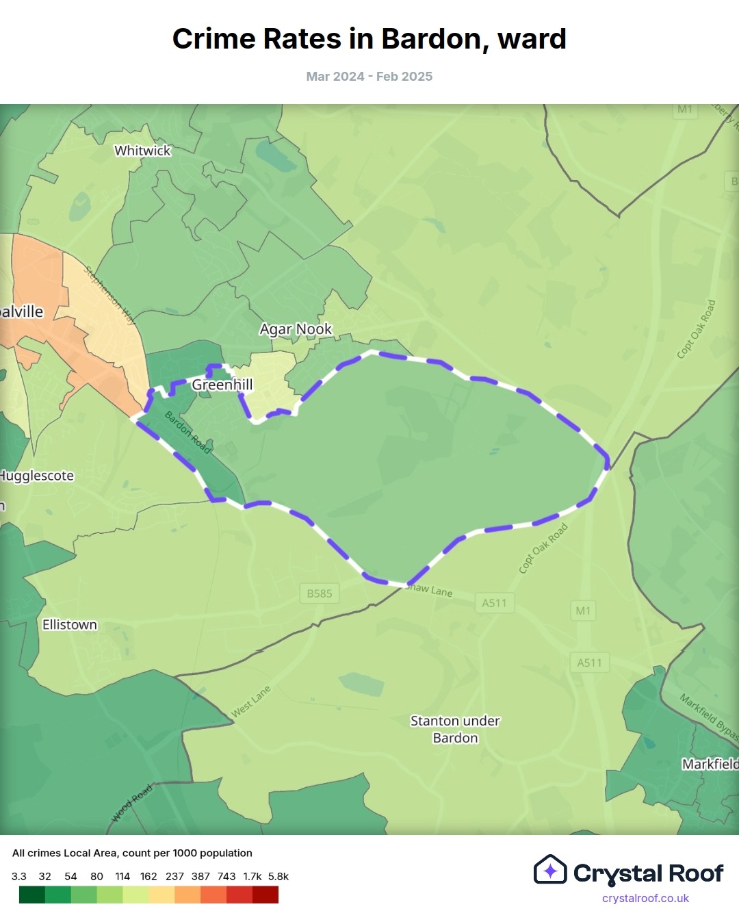 Bardon (ward) is located within North West Leicestershire (borough). Annual total crime rate in North West Leicestershire (borough) is 78.6 crimes per thousand resident population, which can be rated as 3 out of 10 or low crime level compared to other local authority districts in England and Wales.