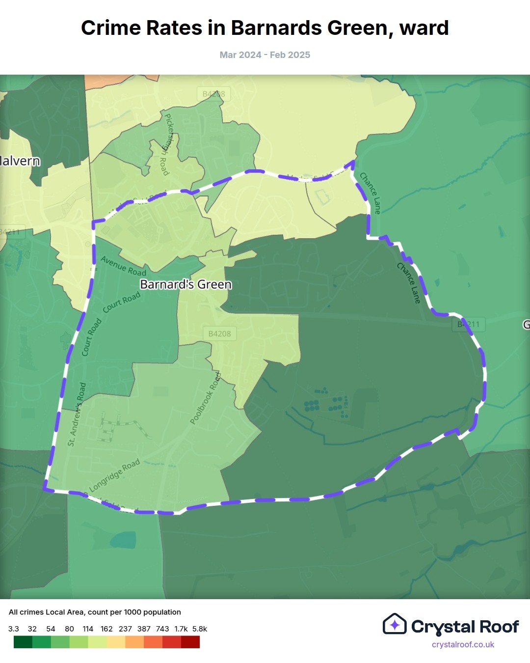 Barnards Green, (ward) includes areas with the following crime ratings (see map):