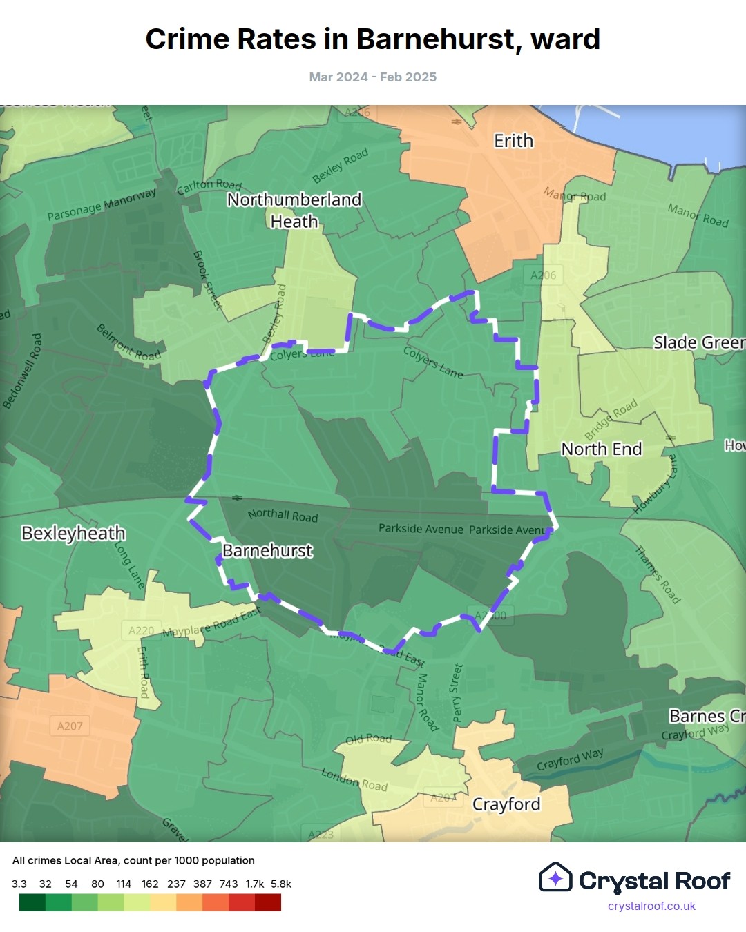 The figures in grey indicate the relative ratings of Barnehurst (ward) for a specific crime type compared to other wards in England and Wales.