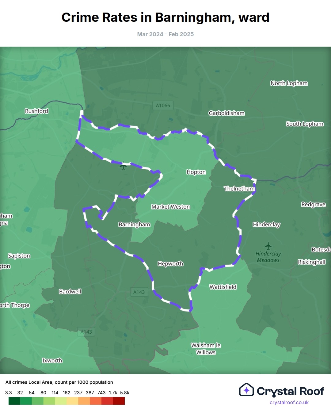 Barningham (ward) is located within West Suffolk (borough). Annual total crime rate in West Suffolk (borough) is 64 crimes per thousand resident population, which can be rated as 2 out of 10 or low crime level compared to other local authority districts in England and Wales.