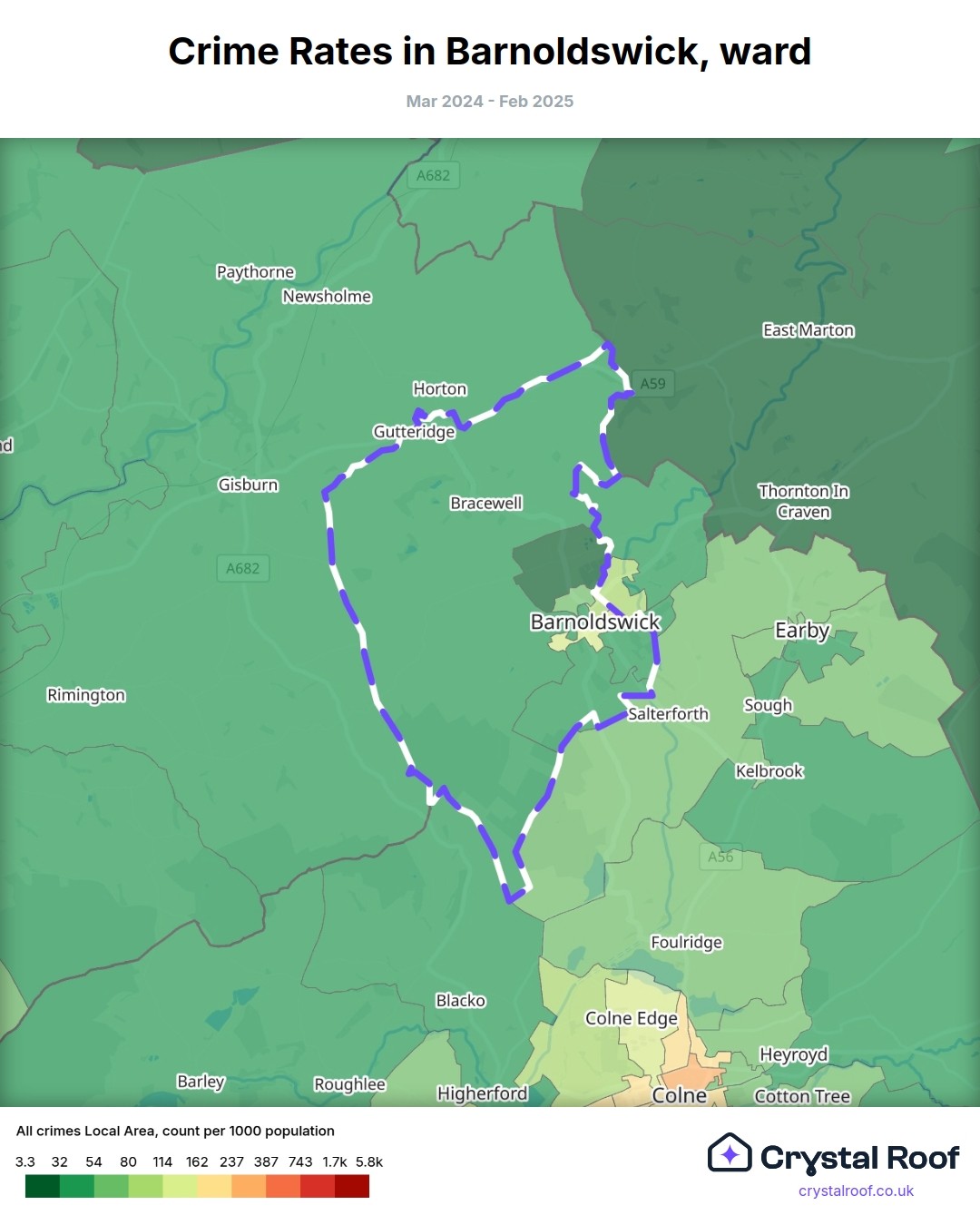 The figures in grey indicate the relative ratings of Barnoldswick (ward) for a specific crime type compared to other wards in England and Wales.