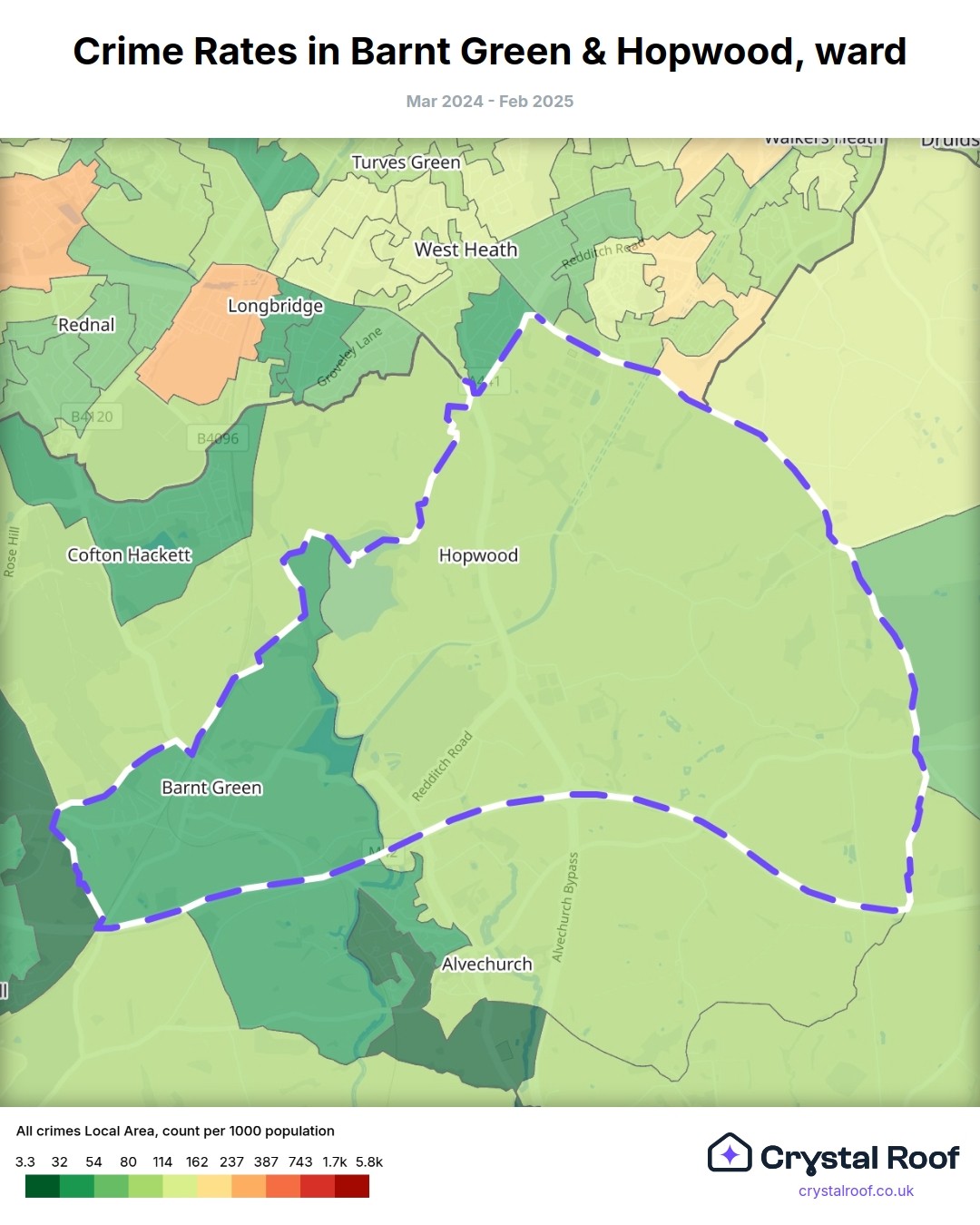 The figures in grey indicate the relative ratings of Barnt Green & Hopwood (ward) for a specific crime type compared to other wards in England and Wales.