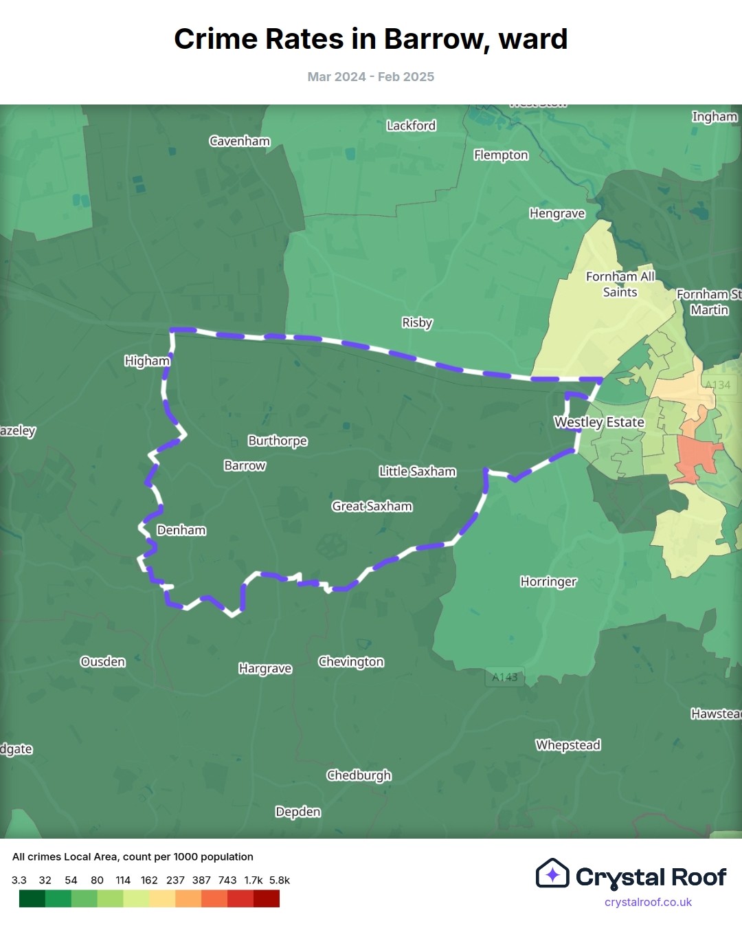 Barrow (ward) is located within West Suffolk (borough). Annual total crime rate in West Suffolk (borough) is 64 crimes per thousand resident population, which can be rated as 2 out of 10 or low crime level compared to other local authority districts in England and Wales.