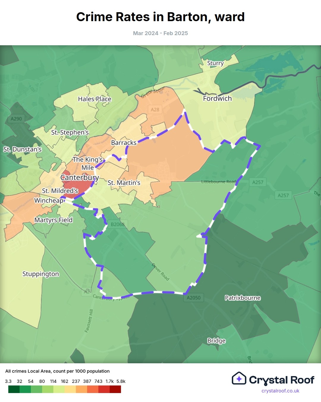 Barton (ward) is located within Canterbury (borough). Annual total crime rate in Canterbury (borough) is 108 crimes per thousand resident population, which can be rated as 5 out of 10 or medium crime level compared to other local authority districts in England and Wales.