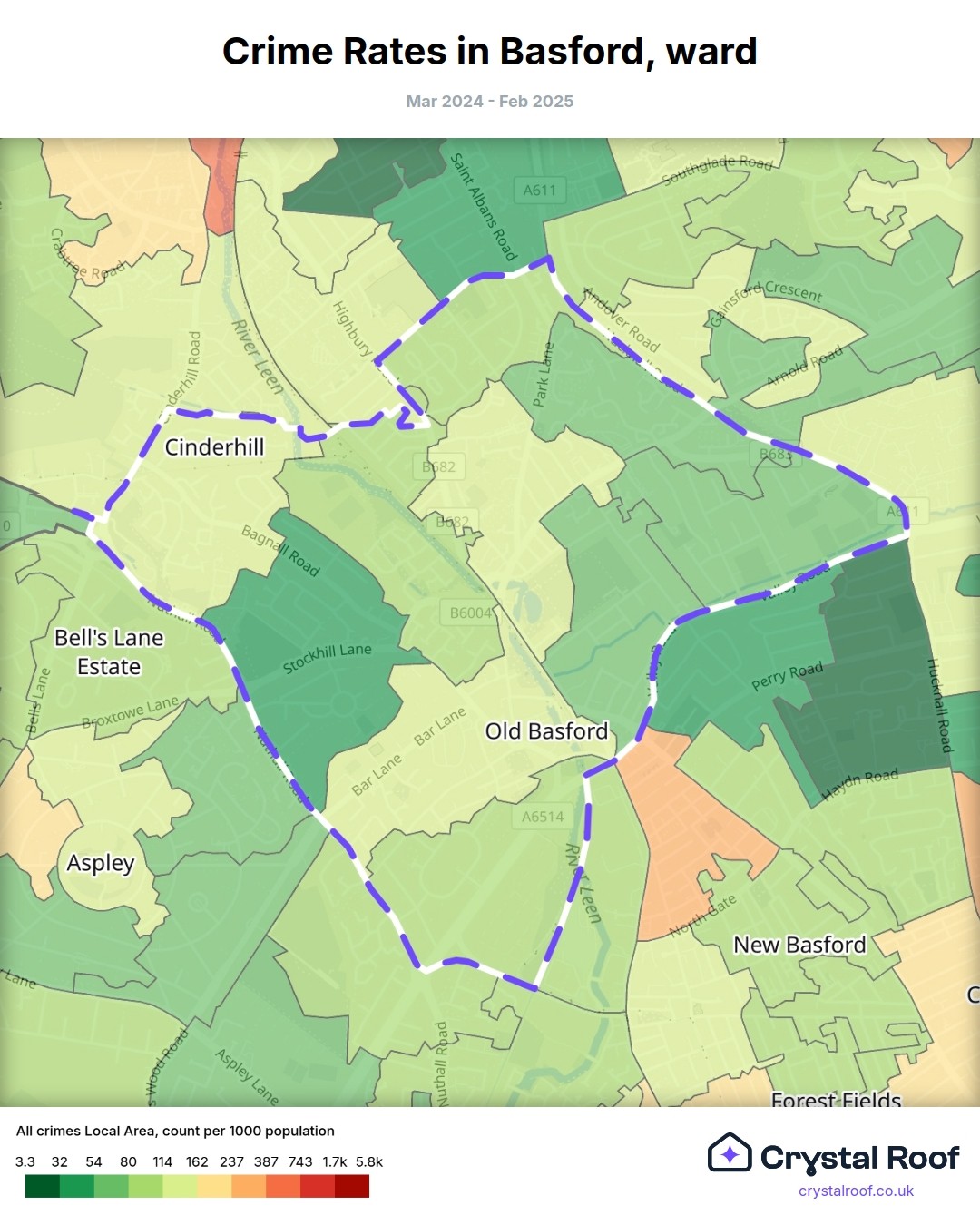 The figures in grey indicate the relative ratings of Basford (ward) for a specific crime type compared to other wards in England and Wales.