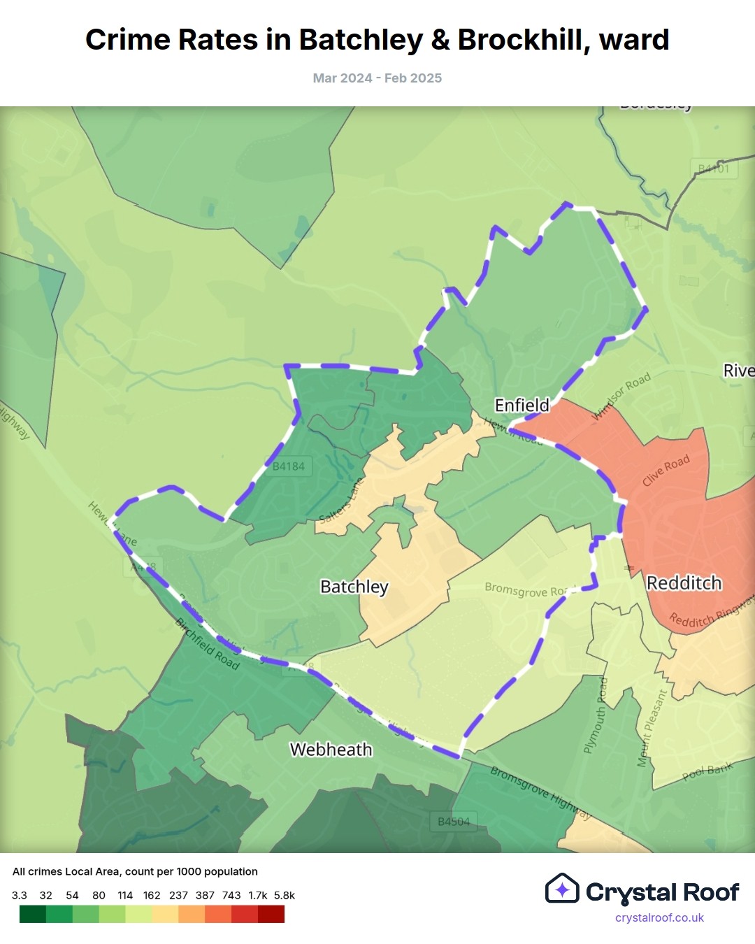 Batchley & Brockhill, (ward) includes areas with the following crime ratings (see map):