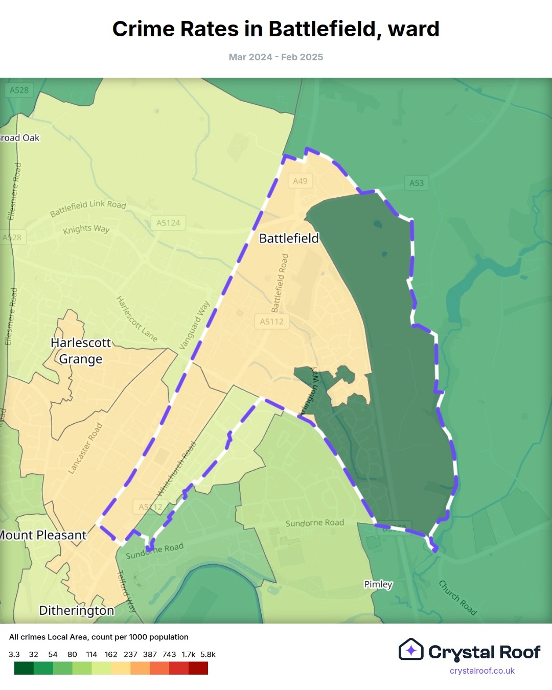 Battlefield (ward) is located within Shropshire (borough). Annual total crime rate in Shropshire (borough) is 62.3 crimes per thousand resident population, which can be rated as 2 out of 10 or low crime level compared to other local authority districts in England and Wales.