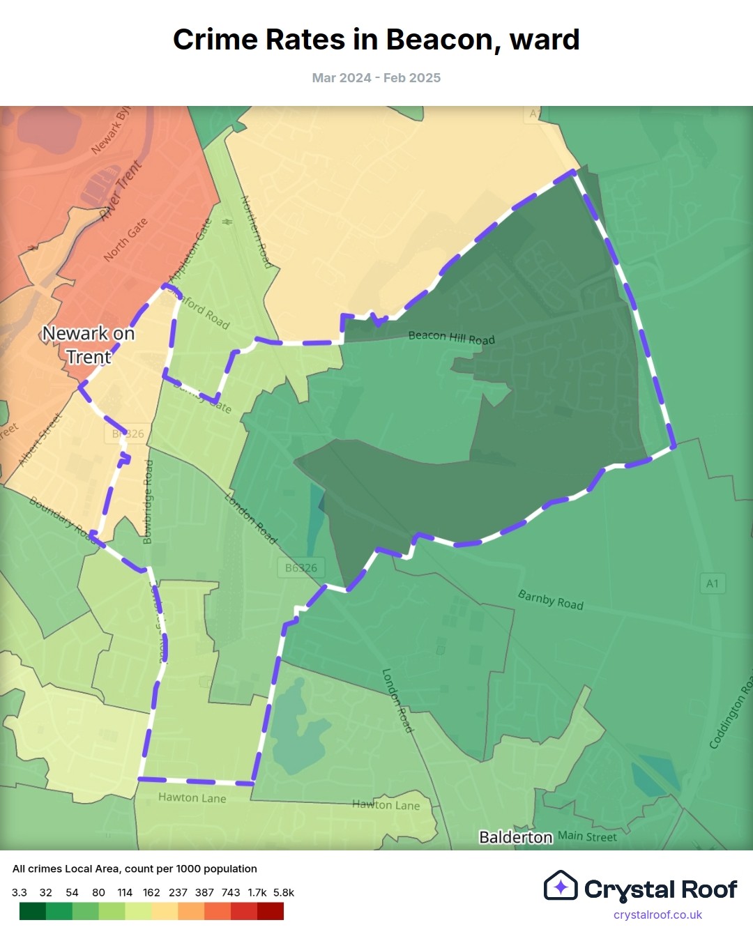 Beacon (ward) is located within Newark and Sherwood (borough). Annual total crime rate in Newark and Sherwood (borough) is 86.1 crimes per thousand resident population, which can be rated as 4 out of 10 or low crime level compared to other local authority districts in England and Wales.