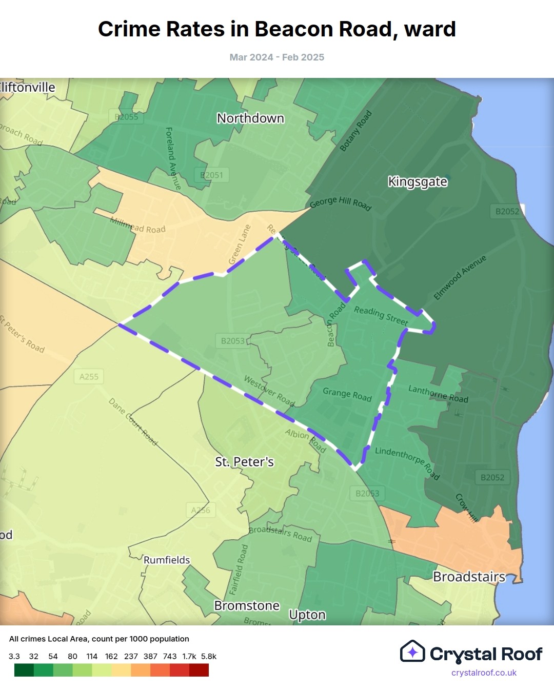 Beacon Road, (ward) includes areas with the following crime ratings (see map):