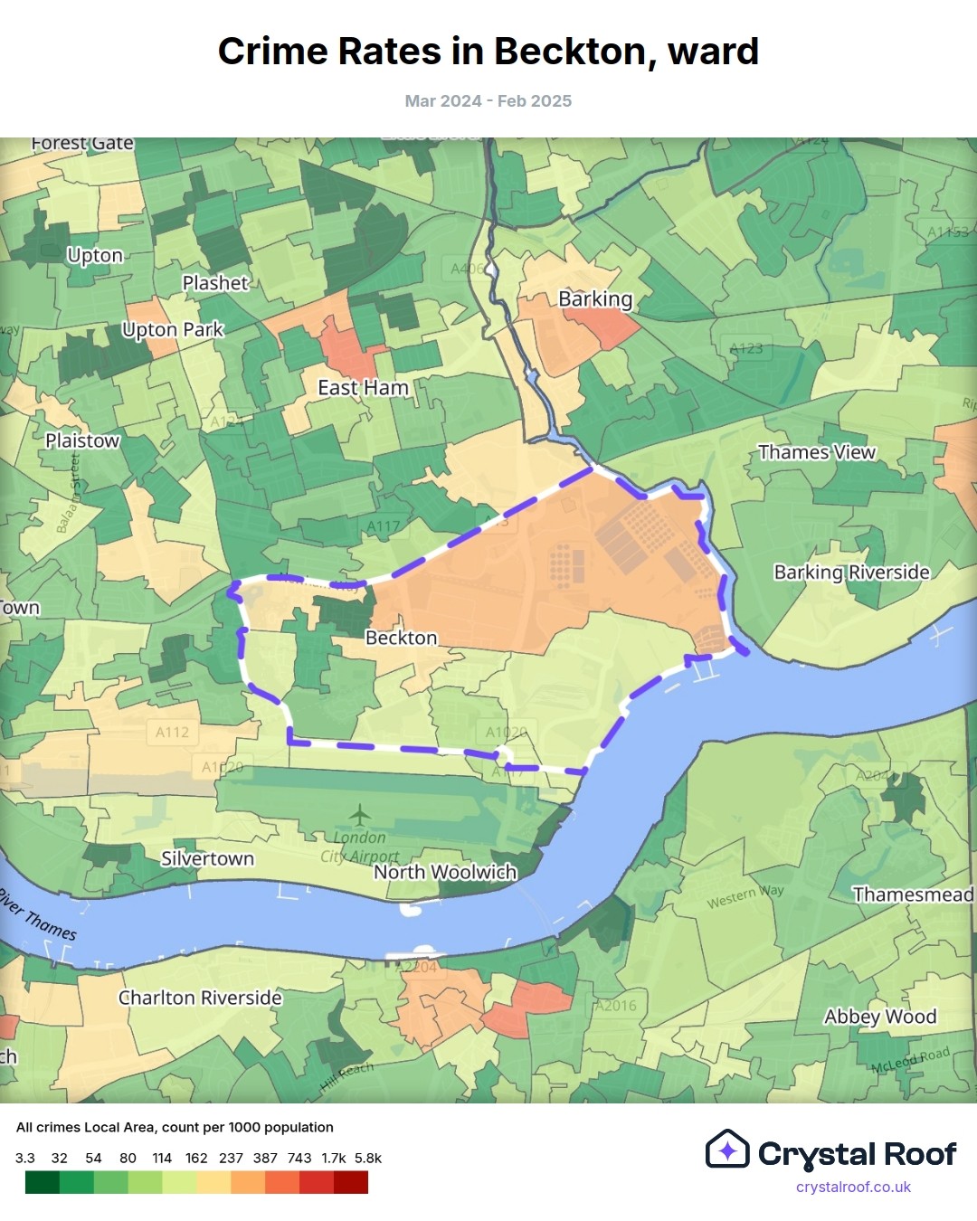The figures in grey indicate the relative ratings of Beckton (ward) for a specific crime type compared to other wards in England and Wales.