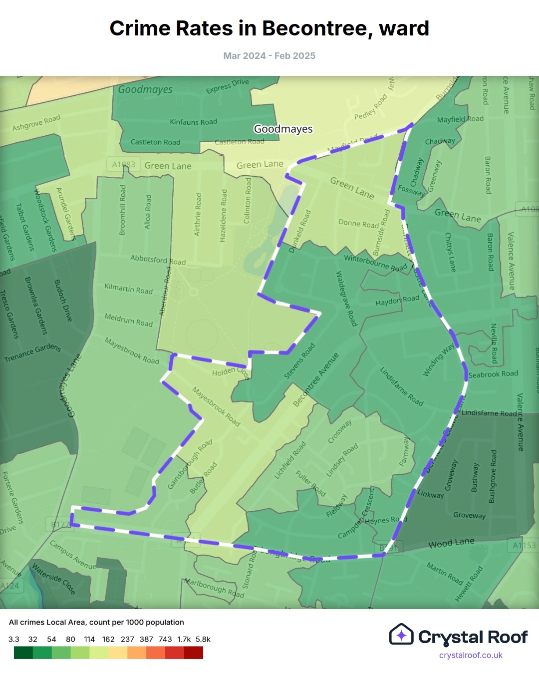 Becontree, (ward) includes areas with the following crime ratings (see map):