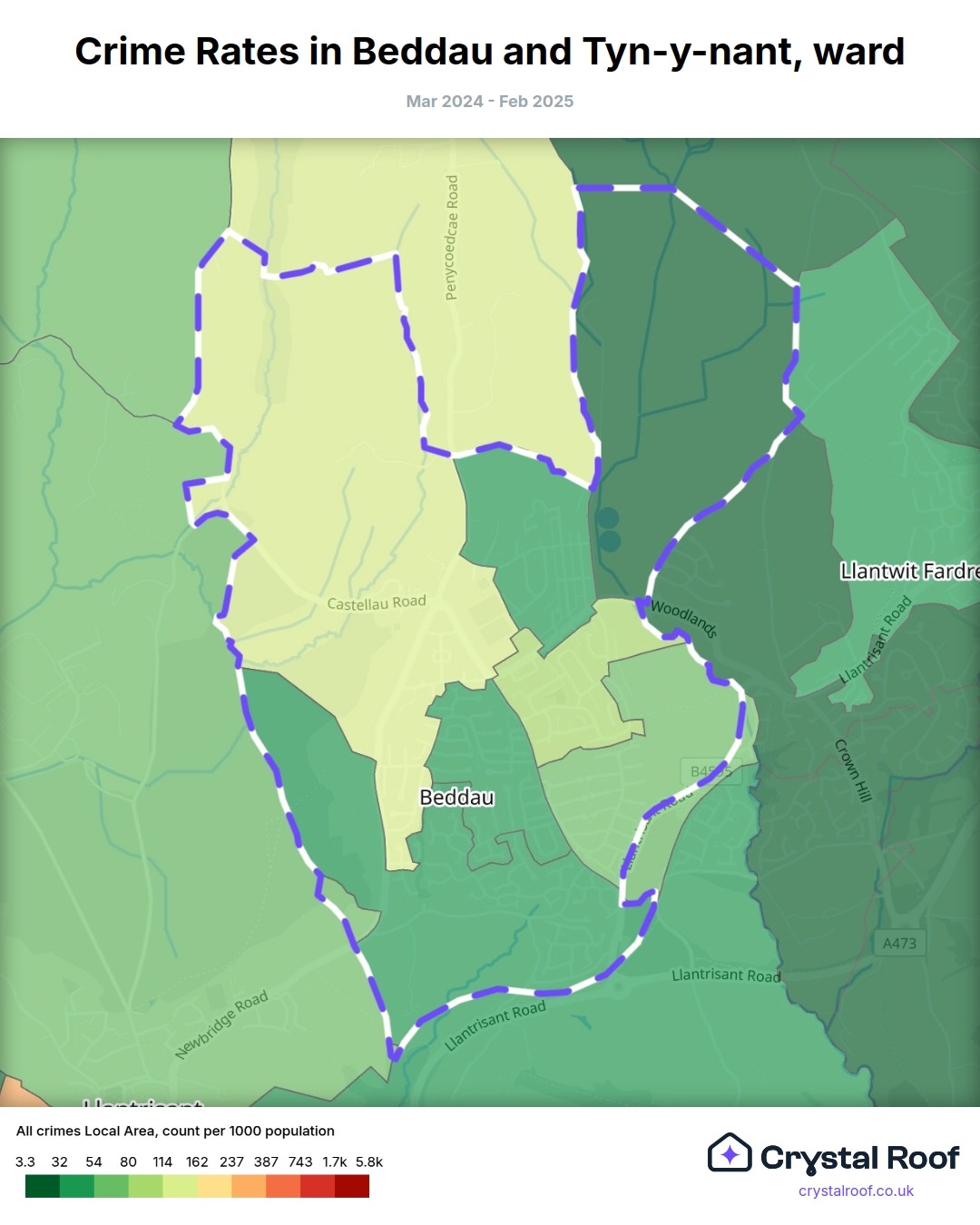 Beddau and Tyn-y-nant, (ward) includes areas with the following crime ratings (see map):
