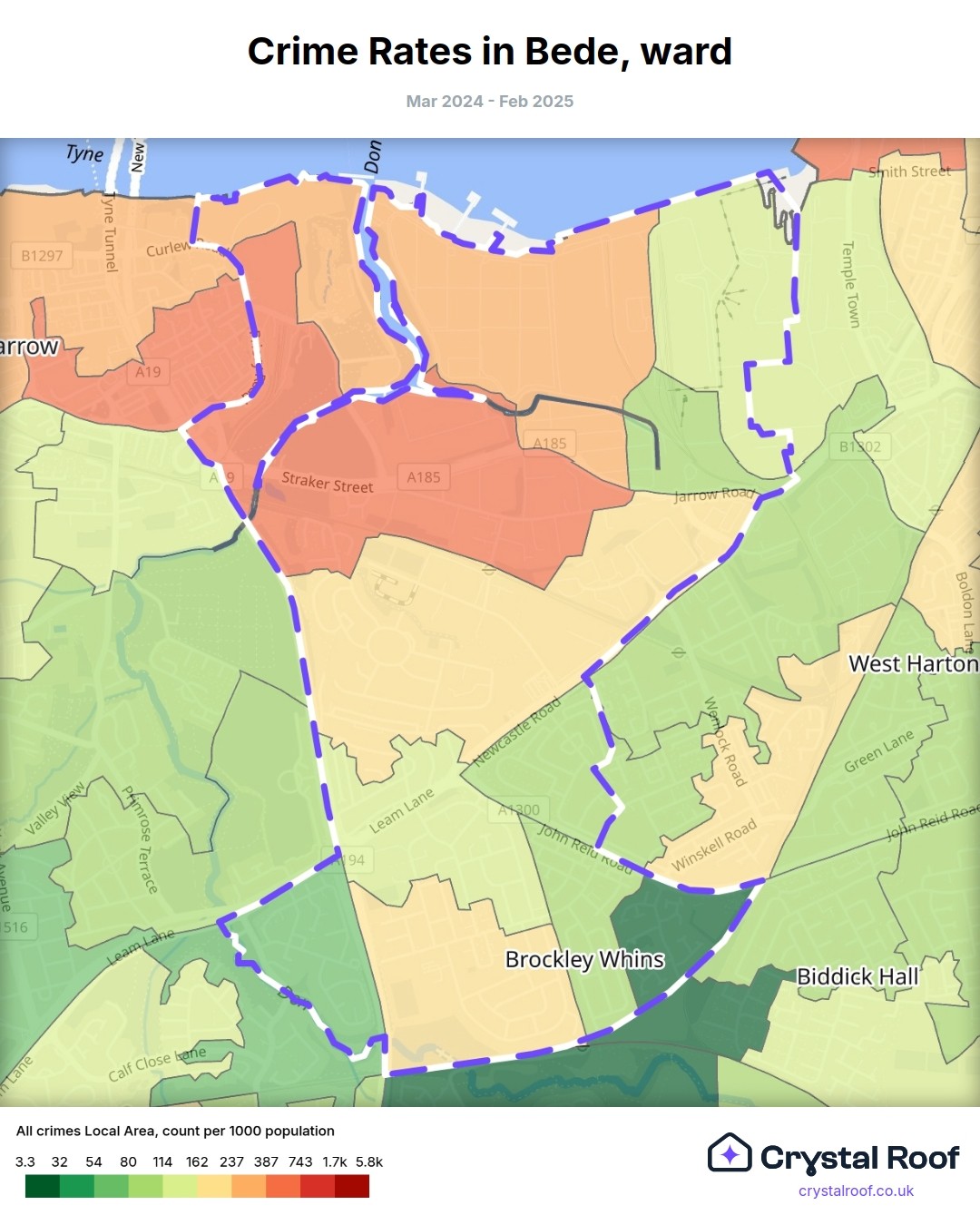 Bede, (ward) includes areas with the following crime ratings (see map):