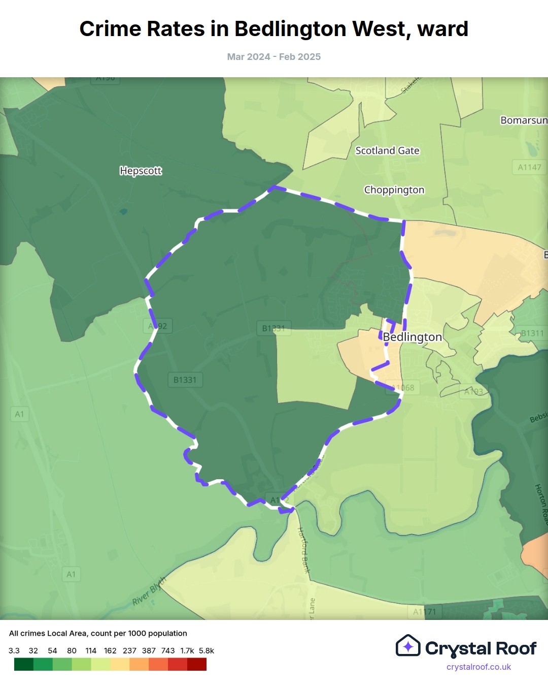 Bedlington West, (ward) includes areas with the following crime ratings (see map):