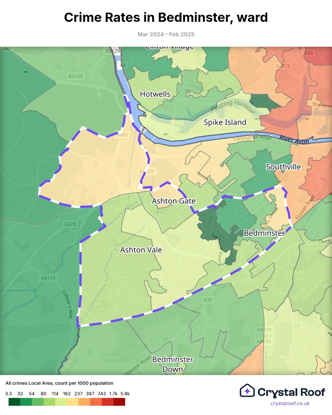 Bedminster, (ward) includes areas with the following crime ratings (see map):