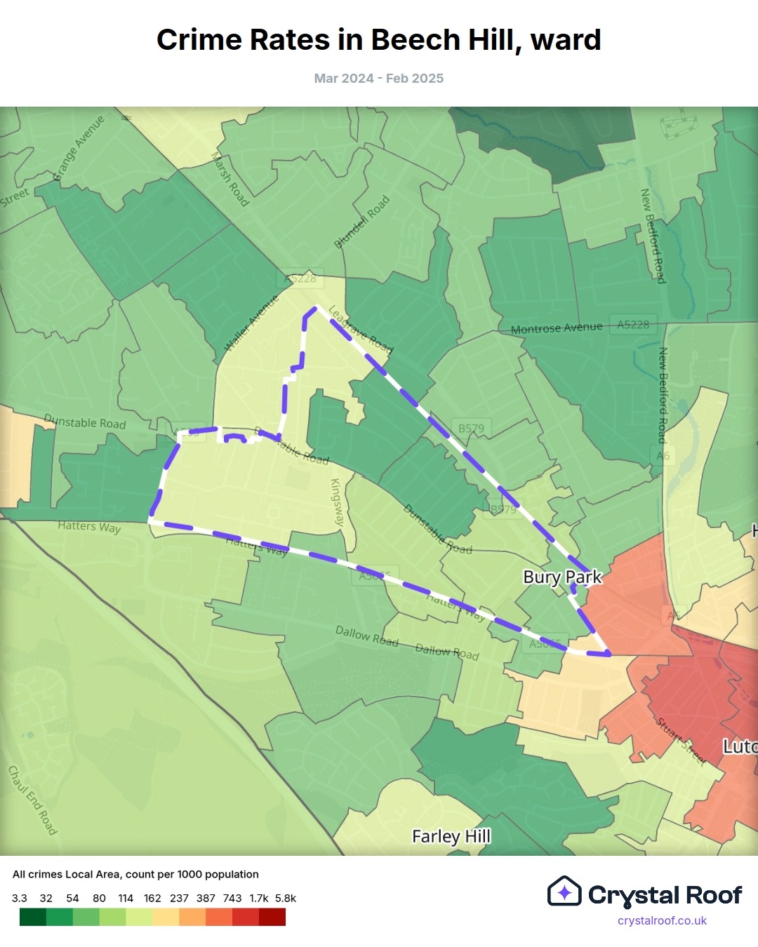 Beech Hill (ward) is located within Luton (borough). Annual total crime rate in Luton (borough) is 101 crimes per thousand resident population, which can be rated as 4 out of 10 or low crime level compared to other local authority districts in England and Wales.
