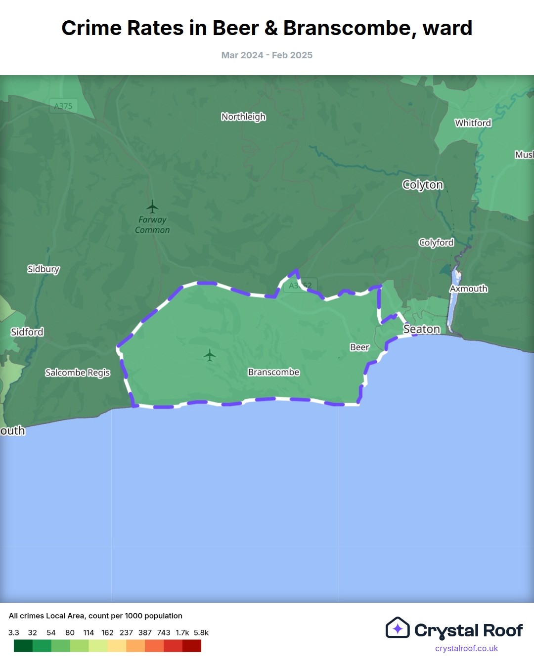 Beer & Branscombe, (ward) includes areas with the following crime ratings (see map):