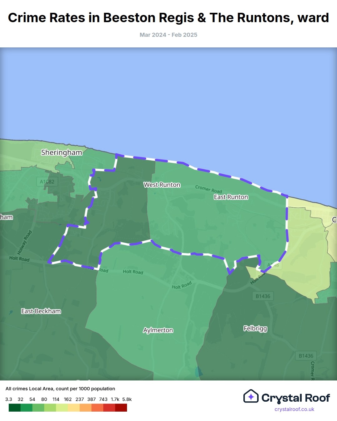Beeston Regis & The Runtons, (ward) includes areas with the following crime ratings (see map):
