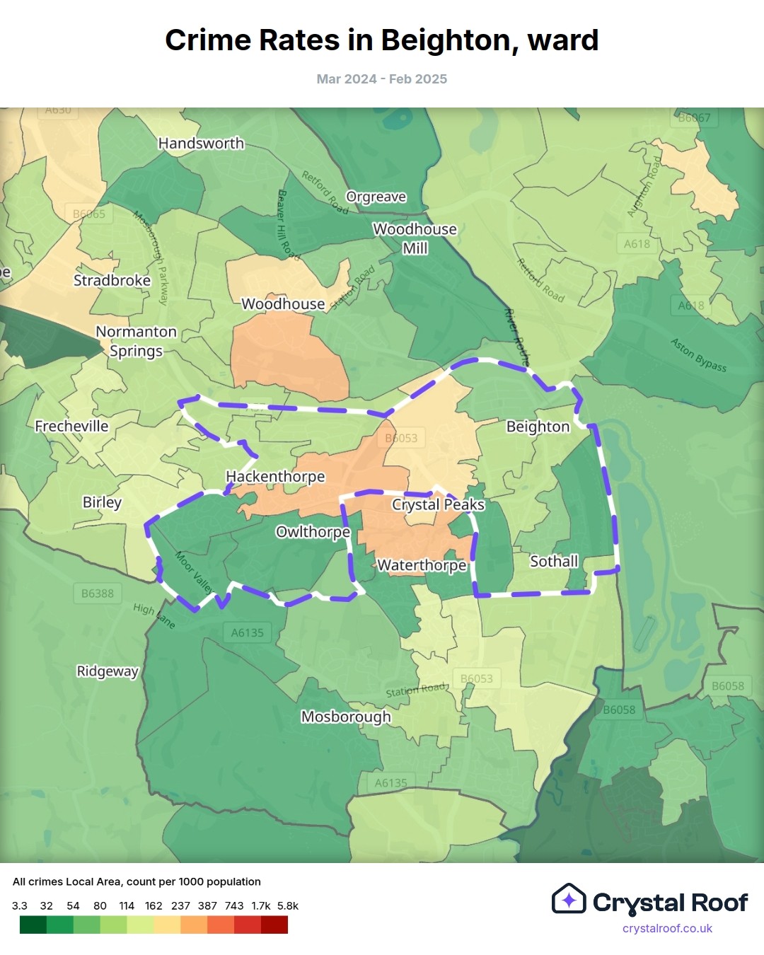 Beighton, (ward) includes areas with the following crime ratings (see map):