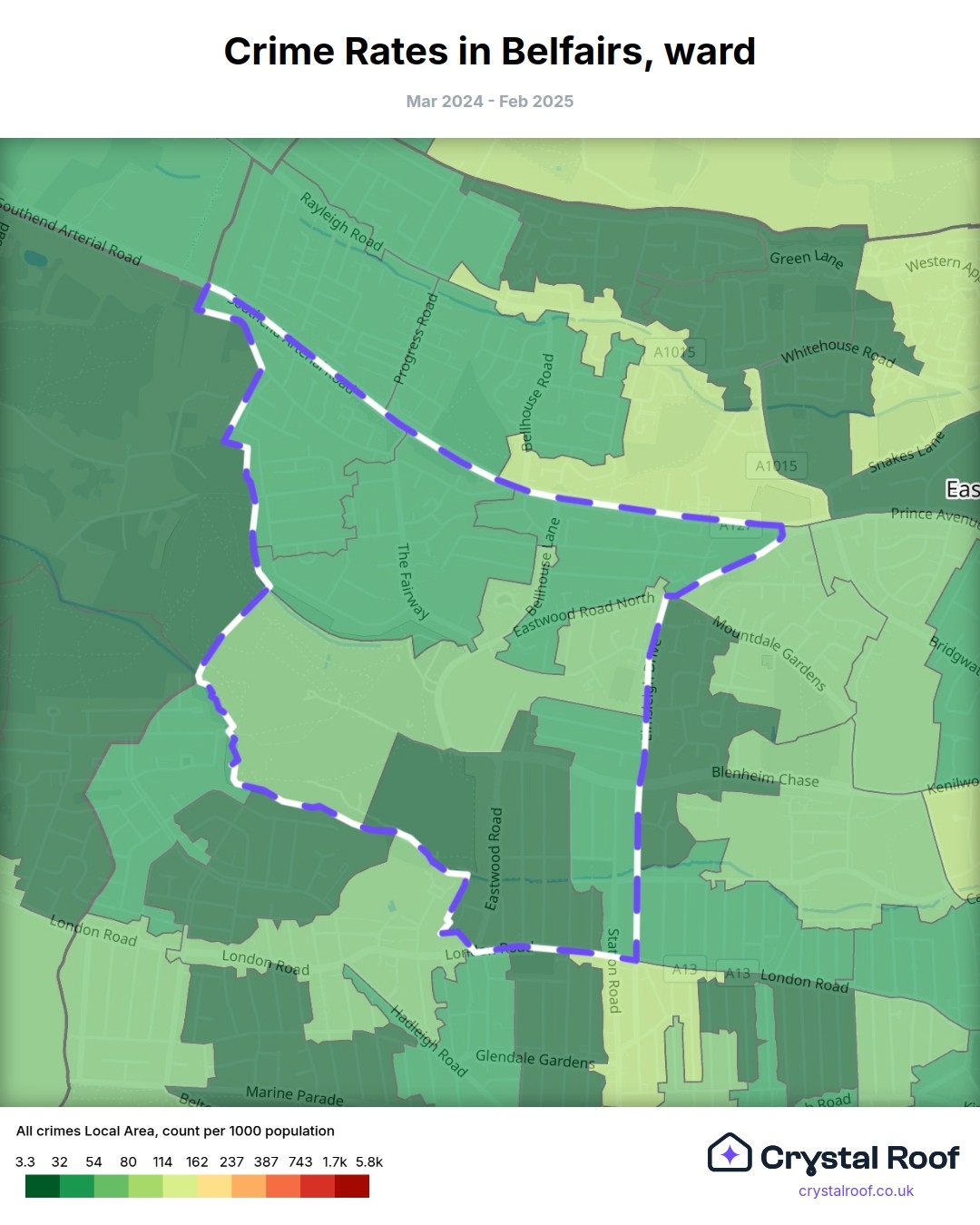Belfairs, (ward) includes areas with the following crime ratings (see map):