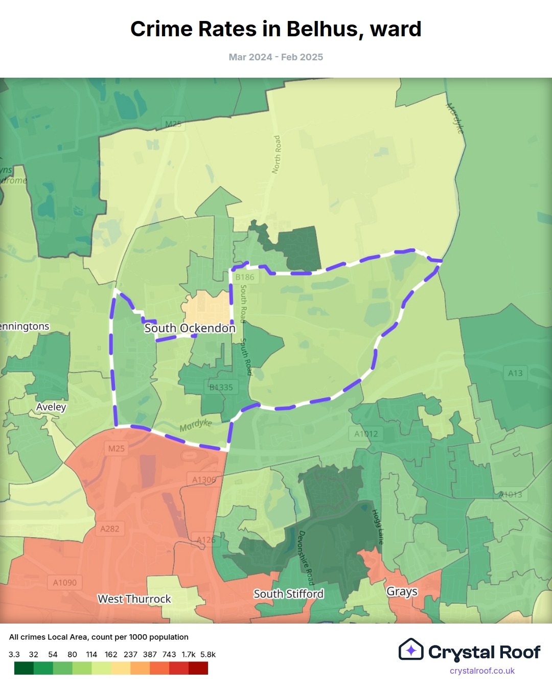 Belhus, (ward) includes areas with the following crime ratings (see map):