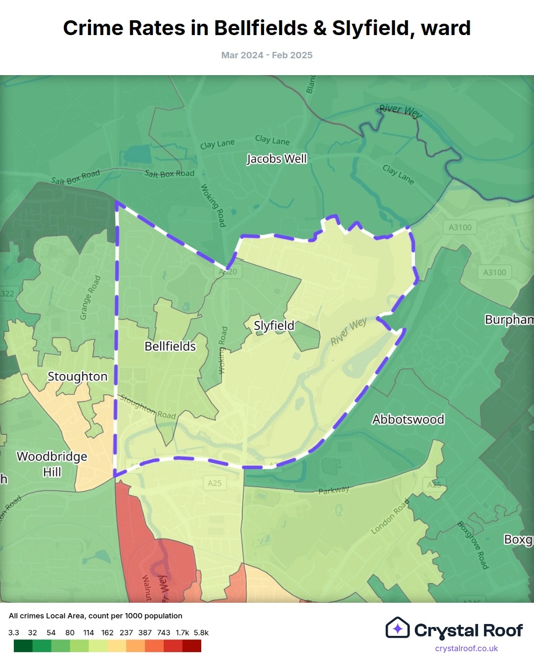 Bellfields & Slyfield, (ward) includes areas with the following crime ratings (see map):