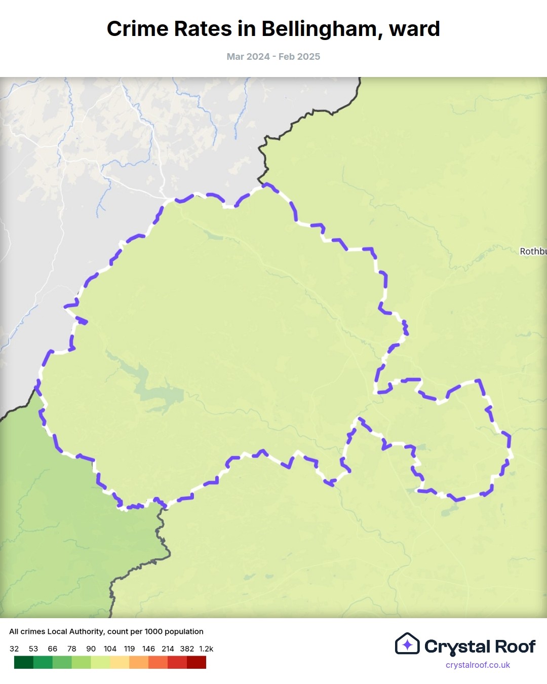 Bellingham (ward) is located within Northumberland (borough). Annual total crime rate in Northumberland (borough) is 94.1 crimes per thousand resident population, which can be rated as 4 out of 10 or low crime level compared to other local authority districts in England and Wales.