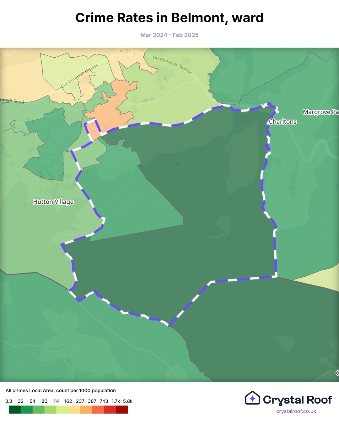 Belmont (ward) is located within Redcar and Cleveland (borough). Annual total crime rate in Redcar and Cleveland (borough) is 139 crimes per thousand resident population, which can be rated as 7 out of 10 or high crime level compared to other local authority districts in England and Wales.