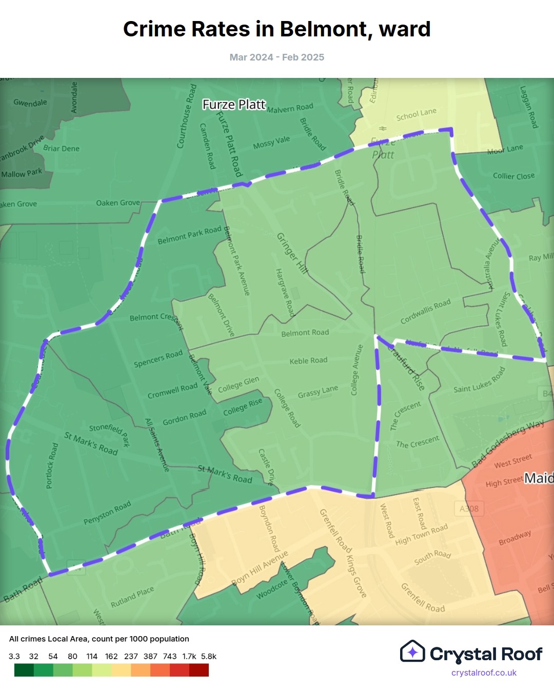 Belmont (ward) is located within Windsor and Maidenhead (borough). Annual total crime rate in Windsor and Maidenhead (borough) is 69.4 crimes per thousand resident population, which can be rated as 2 out of 10 or low crime level compared to other local authority districts in England and Wales.
