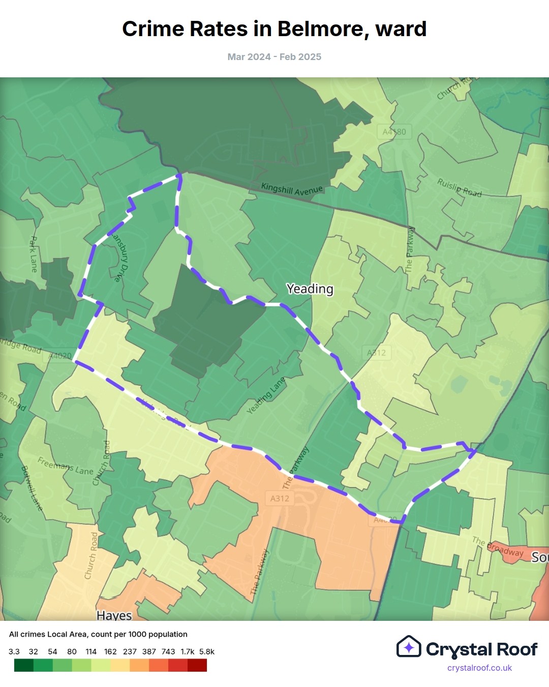 Belmore (ward) is located within Hillingdon (borough). Annual total crime rate in Hillingdon (borough) is 129 crimes per thousand resident population, which can be rated as 6 out of 10 or medium crime level compared to other local authority districts in England and Wales.