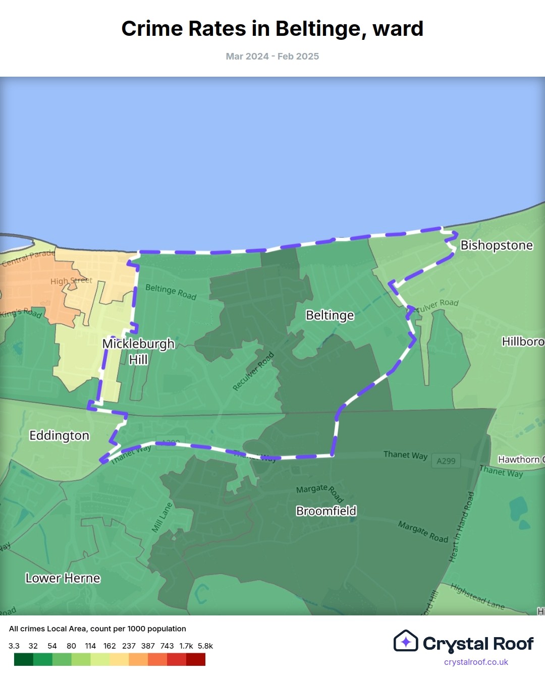 Beltinge, (ward) includes areas with the following crime ratings (see map):
