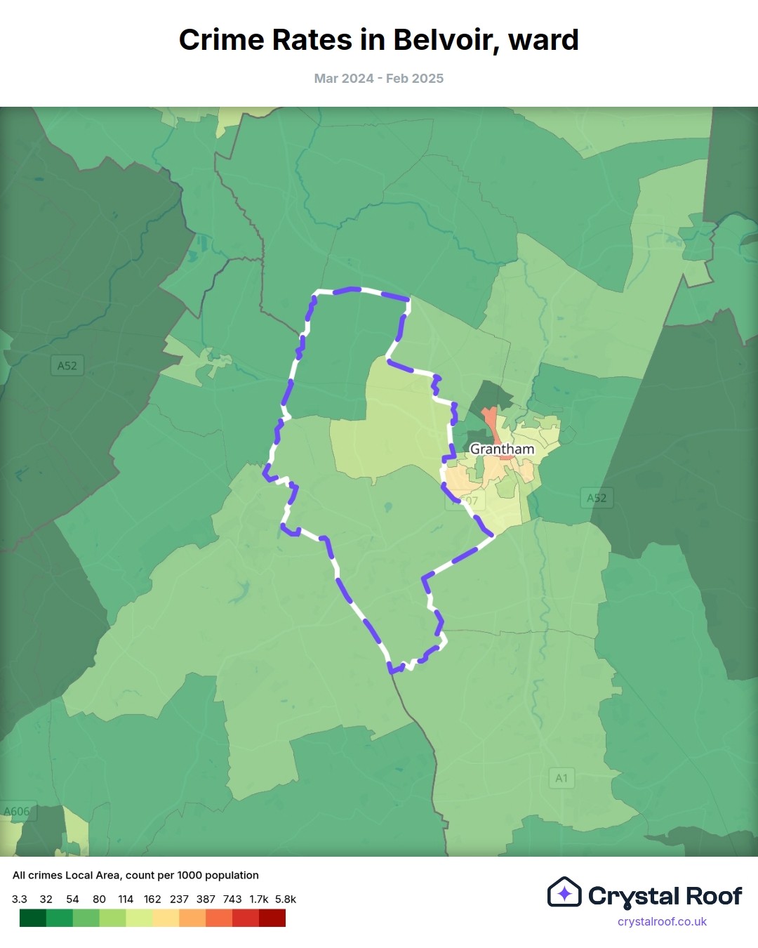 Belvoir (ward) is located within South Kesteven (borough). Annual total crime rate in South Kesteven (borough) is 70.9 crimes per thousand resident population, which can be rated as 2 out of 10 or low crime level compared to other local authority districts in England and Wales.