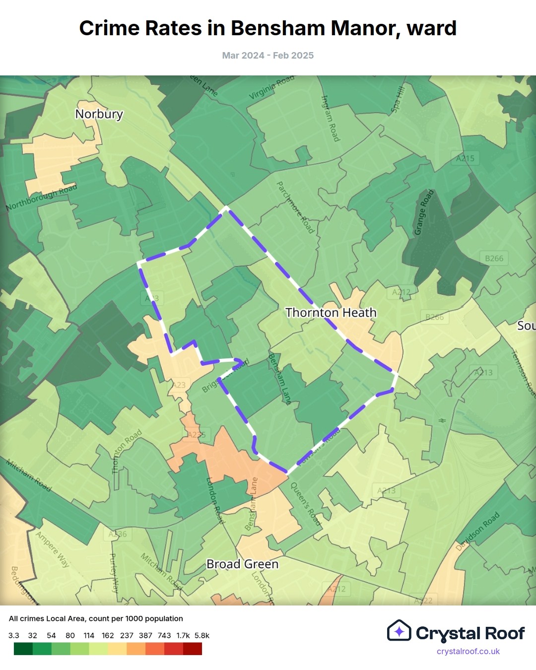 Bensham Manor (ward) is located within Croydon (borough). Annual total crime rate in Croydon (borough) is 111 crimes per thousand resident population, which can be rated as 5 out of 10 or medium crime level compared to other local authority districts in England and Wales.