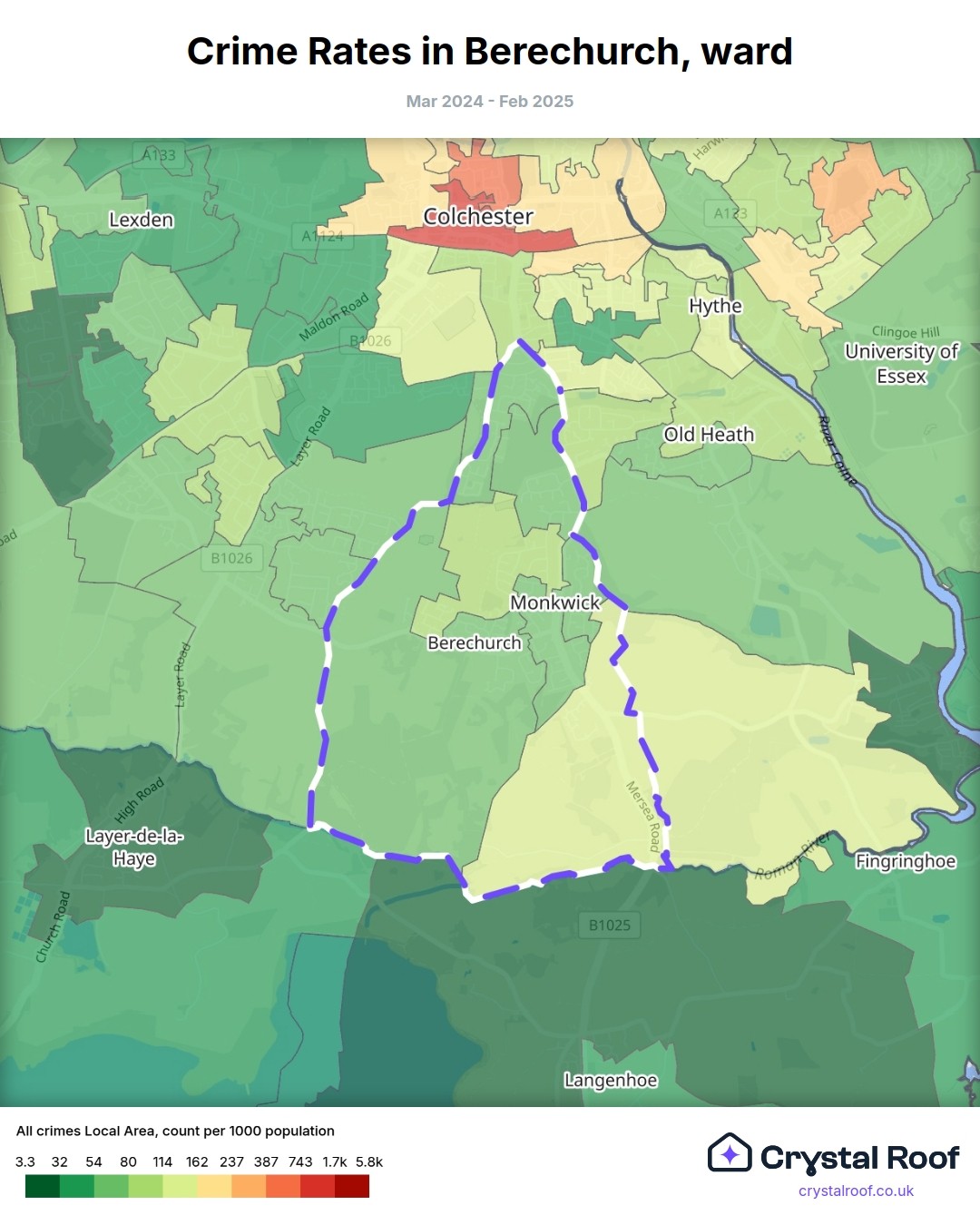 Berechurch, (ward) includes areas with the following crime ratings (see map):