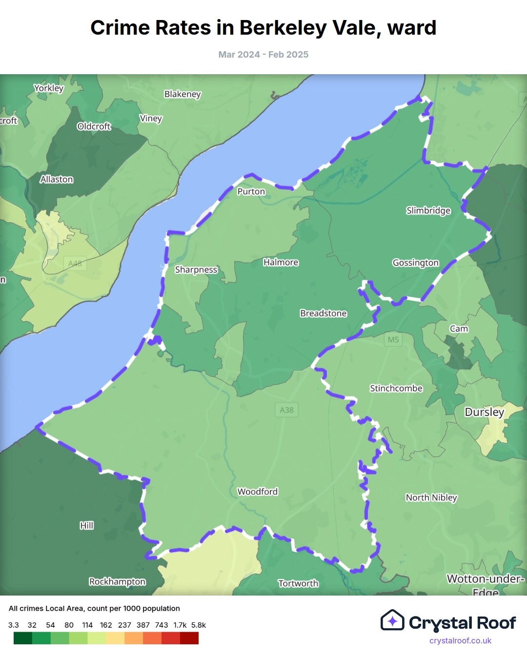 The figures in grey indicate the relative ratings of Berkeley Vale (ward) for a specific crime type compared to other wards in England and Wales.