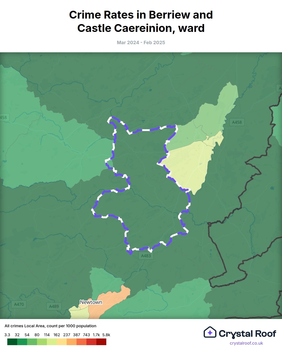 Berriew and Castle Caereinion, (ward) includes areas with the following crime ratings (see map):