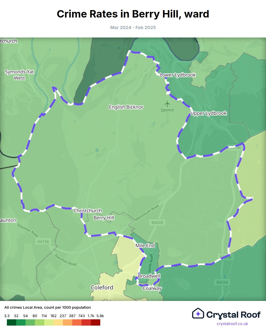 Berry Hill (ward) is located within Forest of Dean (borough). Annual total crime rate in Forest of Dean (borough) is 67.2 crimes per thousand resident population, which can be rated as 2 out of 10 or low crime level compared to other local authority districts in England and Wales.