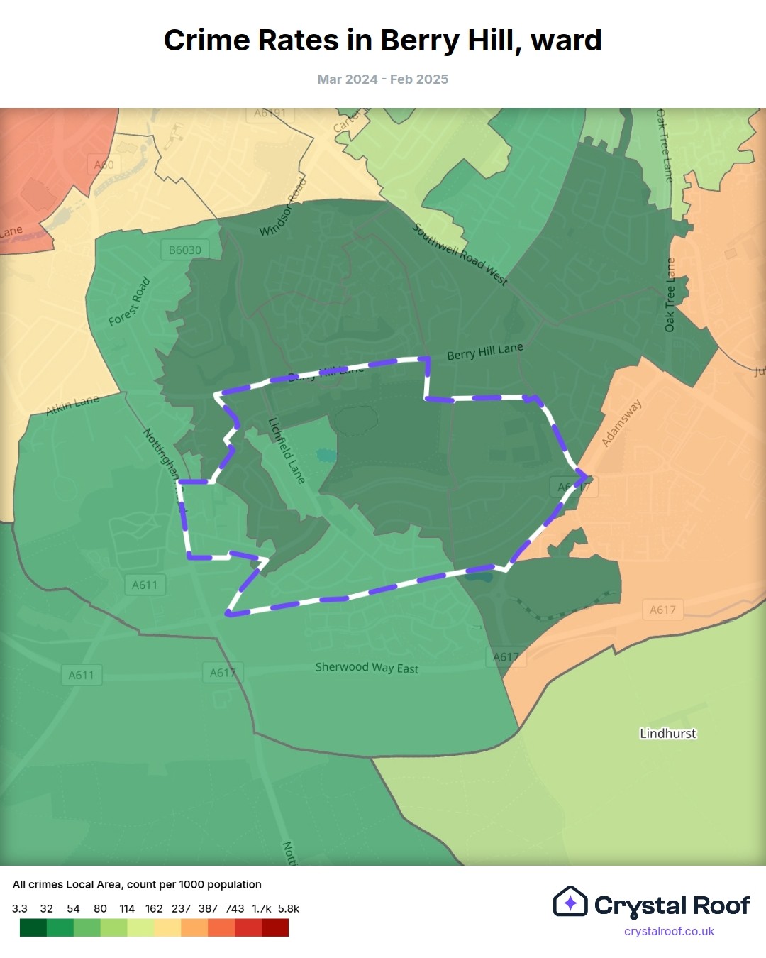 Berry Hill (ward) is located within Mansfield (borough). Annual total crime rate in Mansfield (borough) is 114 crimes per thousand resident population, which can be rated as 5 out of 10 or medium crime level compared to other local authority districts in England and Wales.