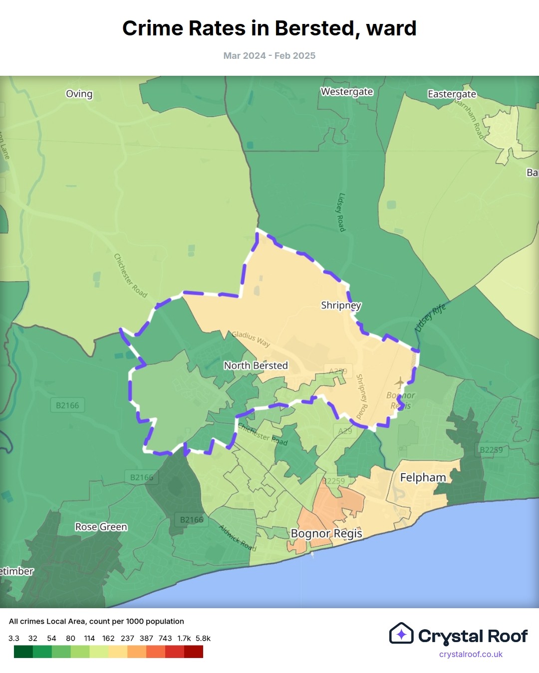 Bersted, (ward) includes areas with the following crime ratings (see map):
