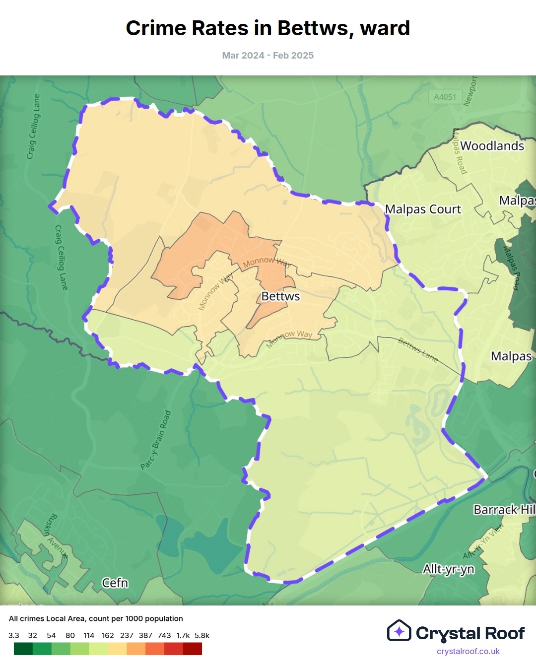 Bettws, (ward) includes areas with the following crime ratings (see map):
