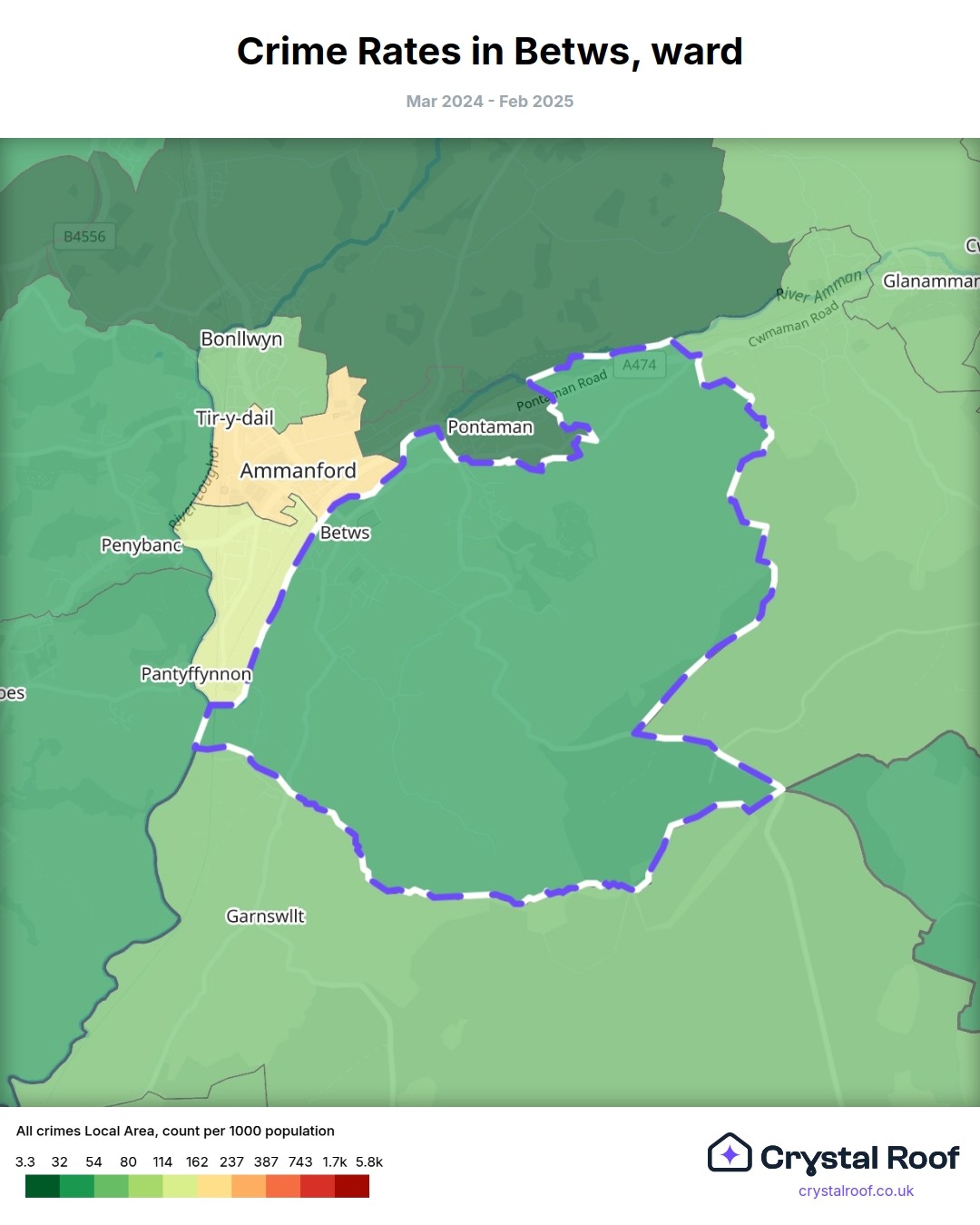 Betws (ward) is located within Carmarthenshire (borough). Annual total crime rate in Carmarthenshire (borough) is 77.8 crimes per thousand resident population, which can be rated as 3 out of 10 or low crime level compared to other local authority districts in England and Wales.
