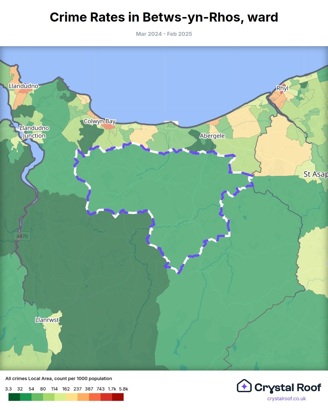 Betws-yn-Rhos, (ward) includes areas with the following crime ratings (see map):