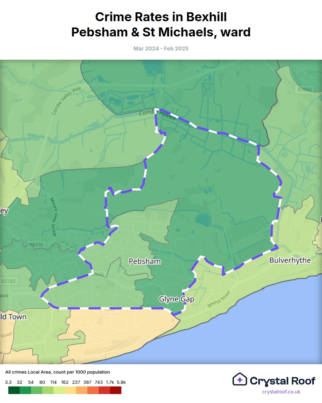 Bexhill Pebsham & St Michaels, (ward) includes areas with the following crime ratings (see map):