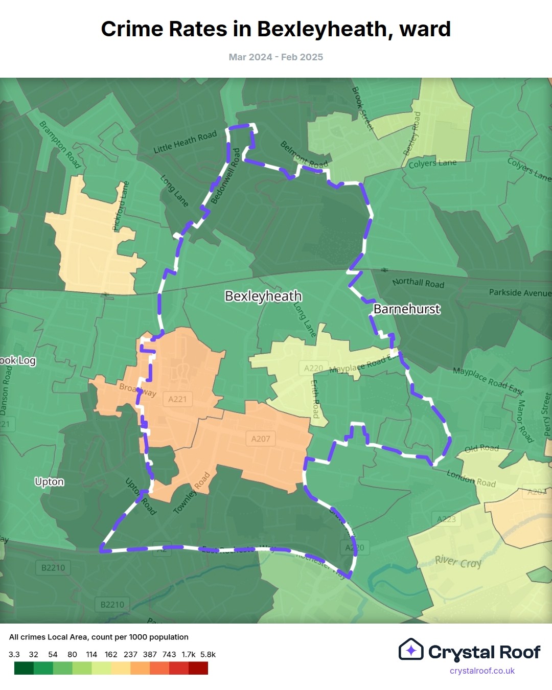 Bexleyheath, (ward) includes areas with the following crime ratings (see map):