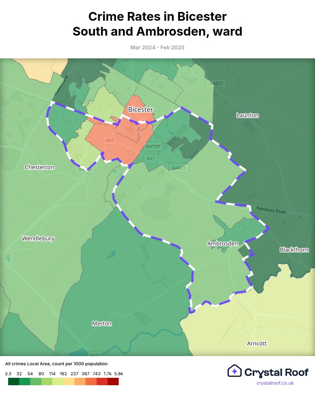 Bicester South and Ambrosden, (ward) includes areas with the following crime ratings (see map):