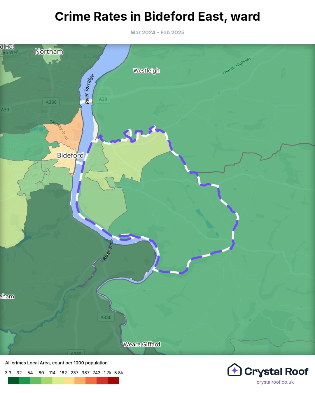 Bideford East, (ward) includes areas with the following crime ratings (see map):