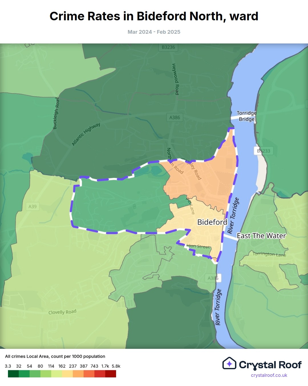 Bideford North, (ward) includes areas with the following crime ratings (see map):